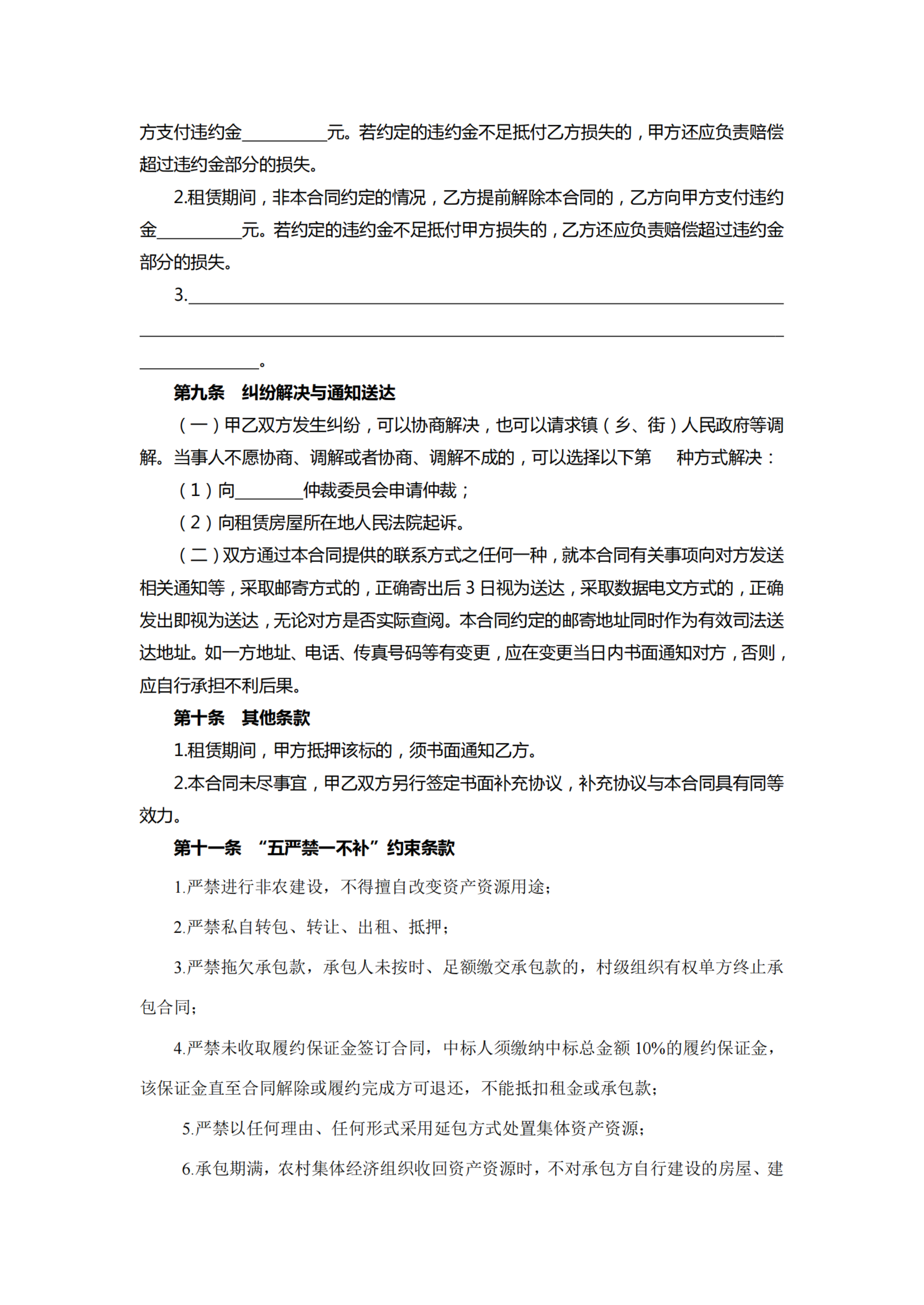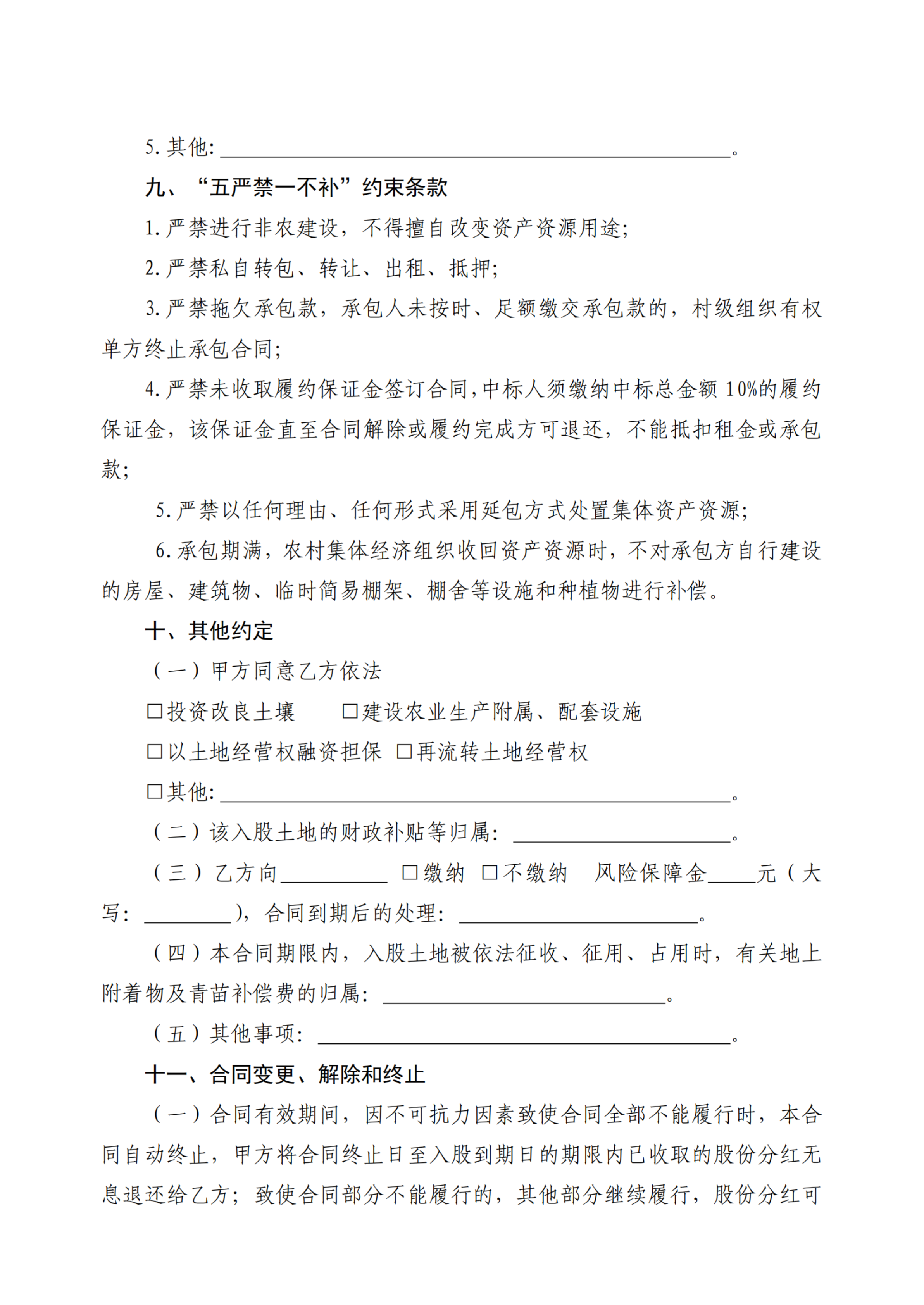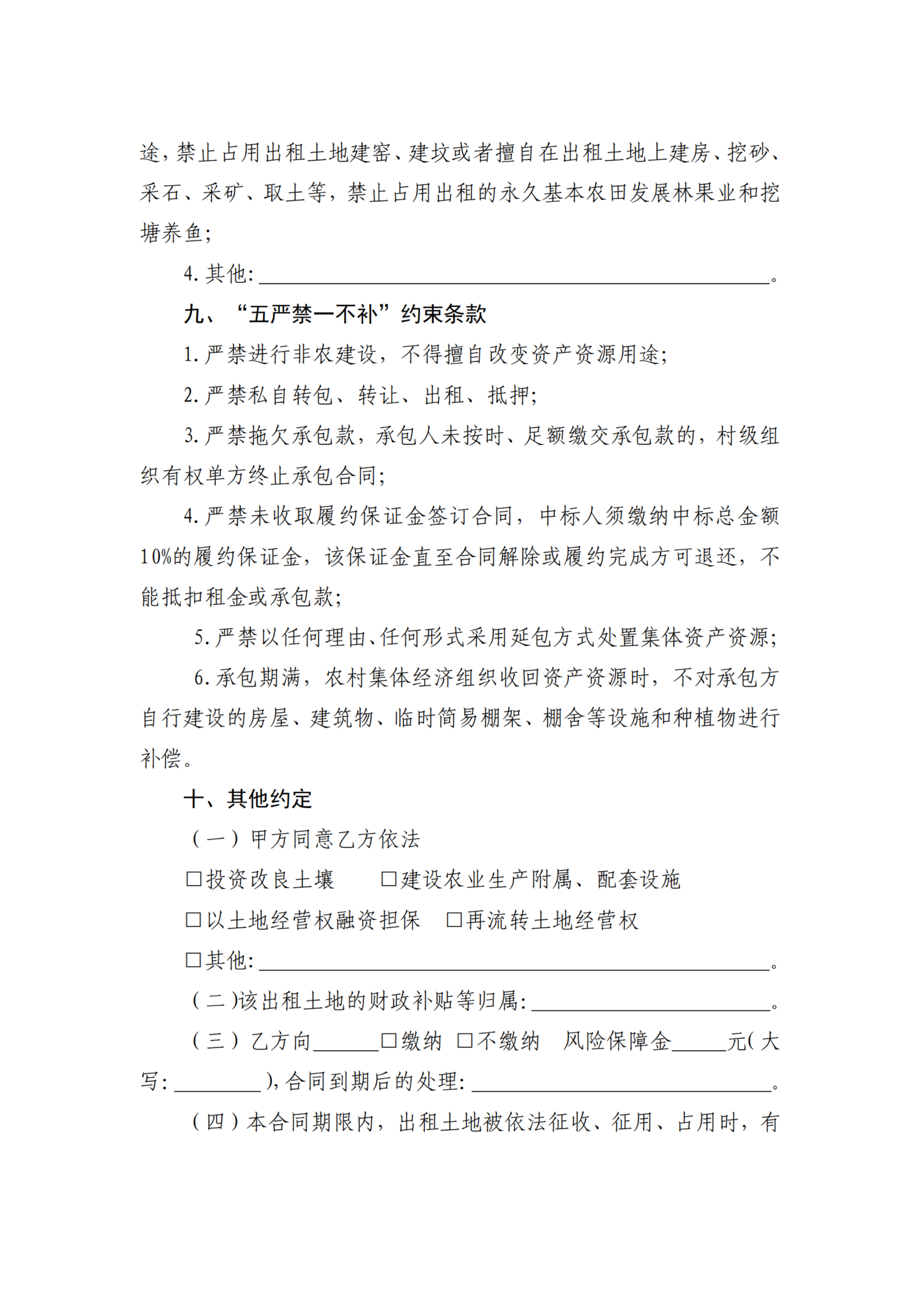 由区农业农村局统一下发村(社区)集体经济合同示范文本(详见附件6),合同条款须明确载明“五严禁一不补”约束条款,即: