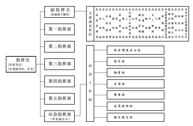 区防指启动应急响应时根据要求成立应急指挥部,设立综合调度办公室、技术组、物资组、宣传组、督查组、应急抢险组、核灾救灾组等“一室六组”。应急工作组由相关成员单位或部门工作人员组成,在启动应急响应时,按照本预案的要求在区防指集中开展工作,共同应对响应期间防汛抗旱工作。“一室六组”组成如下: