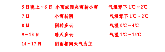 从发布会获悉,我区未来几天天气预测:6~7 号,雨夹雪转小雪,局部中雪,积雪深度 1~3 厘米,有冰冻和道路结冰,最低气温零下 2~零下 1℃;8 号阴天转多云。春节假期前期(9~13 号)天气较好,气温逐渐回升,有利于假日户外出行;后期(14 日以后)以阴雨相间天气为主。