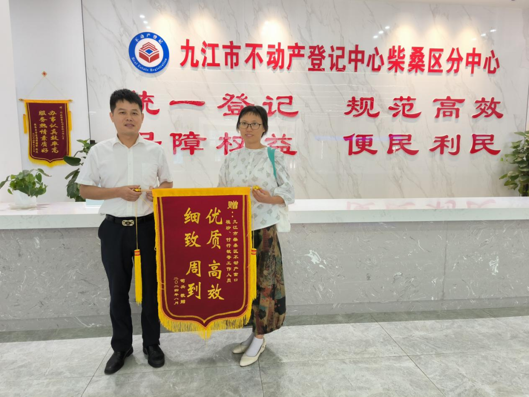近日,柴桑区不动产登记分中心收到办事群众送来的一面锦旗,高度赞扬桂珍、付行敏等工作人员在办理不动产登记中提供的“优质、高效、细致、周到”的登记服务。