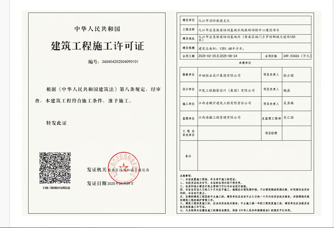 核发九江市应急救援培训基地水域救助训练中心建设项目建筑施工许可证