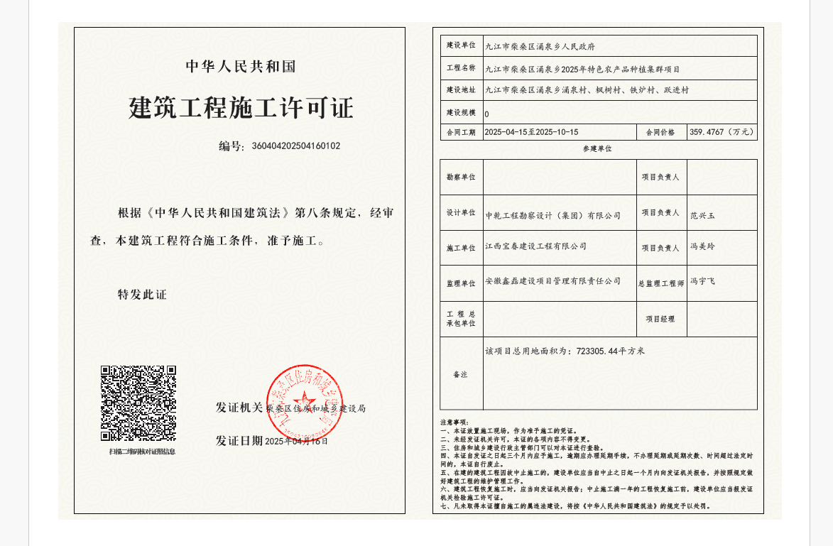 核发九江市柴桑区涌泉乡2025年特色农产品种植集群项目建筑工程施工许可证