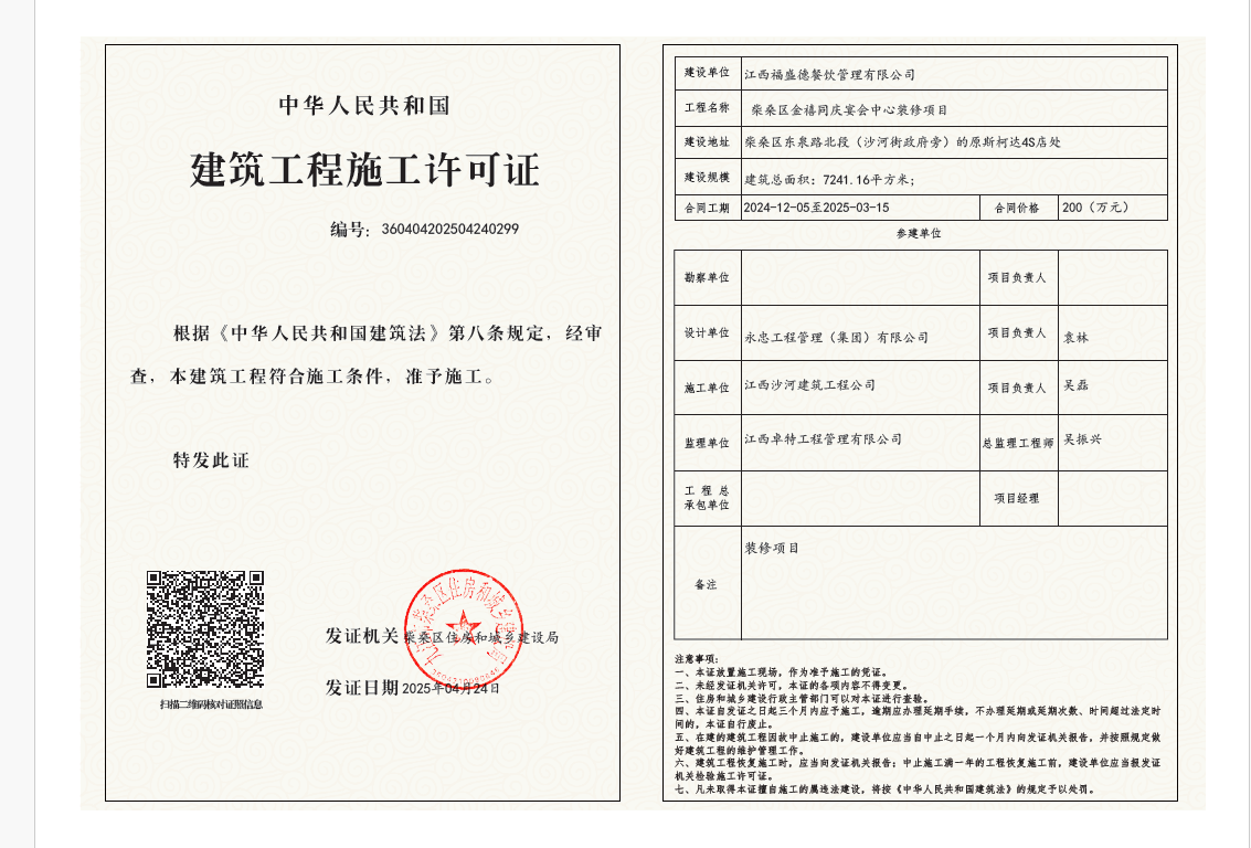 核发柴桑区金禧同庆宴会中心装修项目建筑工程施工许可证