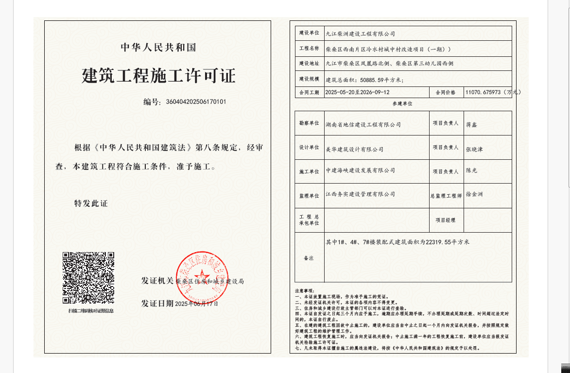 核发柴桑区西南片区冷水村城中村改造项目(一期))施工许可证