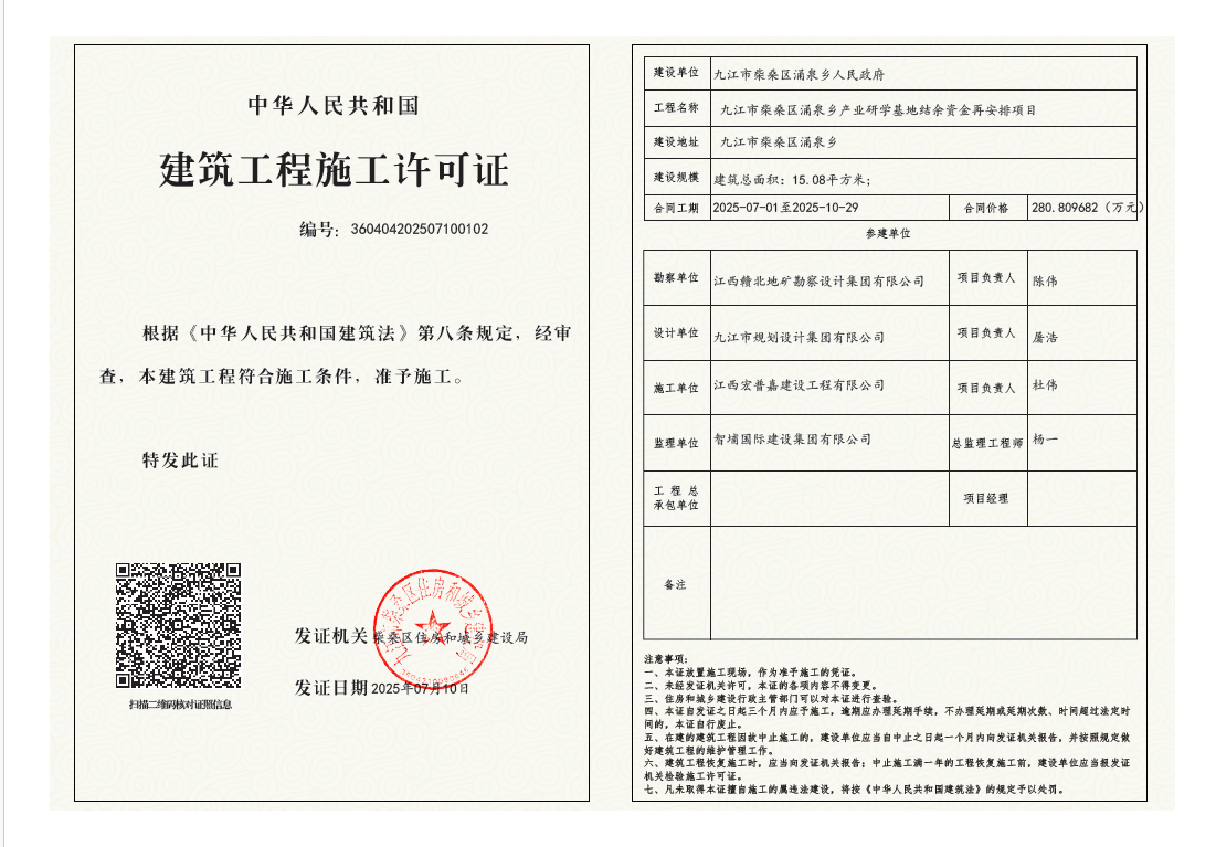 核发九江市柴桑区涌泉乡产业研学基地结余资金再安排项目施工许可证