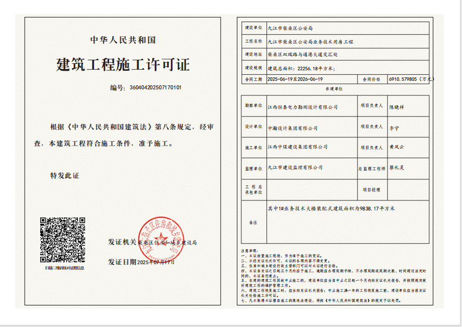 核发九江市柴桑区公安局业务技术用房工程施工许可证