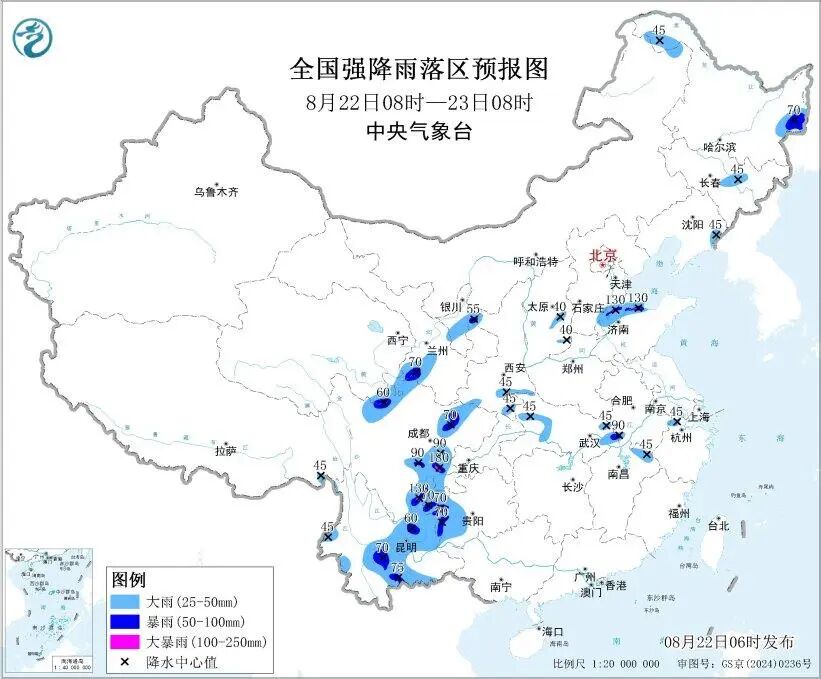 据中央气象台预计,8月22日8时至23日8时,黑龙江西北部和东部、吉林中部、辽宁东部、青海东南部、甘肃中南部、宁夏中部、陕西南部、山西东部、山东北部、湖北东部和西部、江西北部、川西高原北部、四川盆地中西部和南部、贵州西部、云南中东部和西南部等地部分地区有大到暴雨,其中,山东北部、四川盆地南部、云南东北部等地局地有大暴雨(100~180毫米)。上述部分地区伴有短时强降水(最大小时降雨量20~50毫米,局地可超过70毫米),局地有雷暴大风等强对流天气。