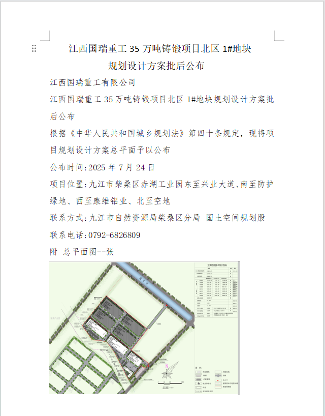 江西国瑞重工35万吨铸锻项目北区1#地块规划设计方案批后公布