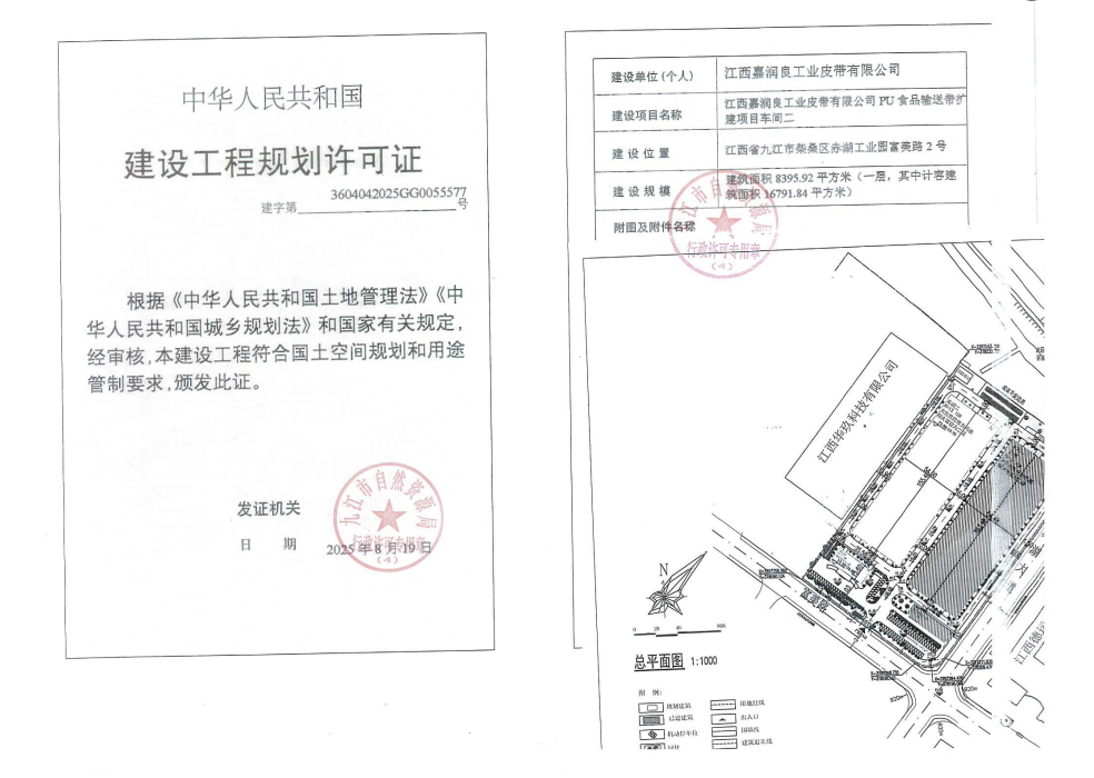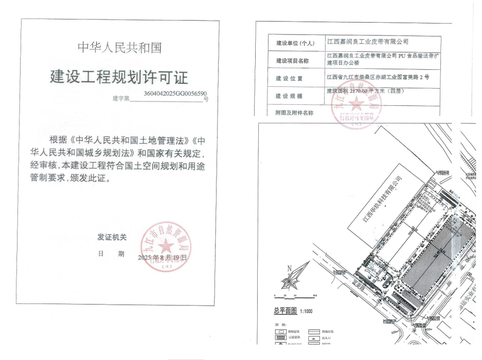 江西嘉润良工业皮带有限公司PU食品输送带扩建项目办公楼、车间二建设工程规划许可批准结果公示