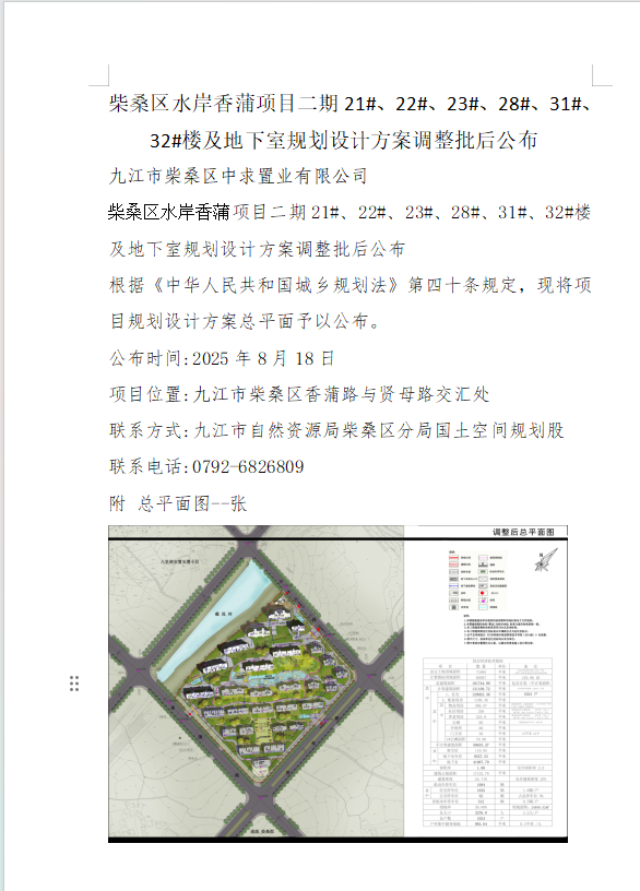 柴桑区水岸香蒲项目二期21#、22#、23#、28#、31#、32#楼及地下室规划设计方案调整批后公布