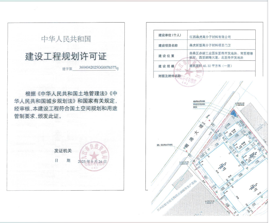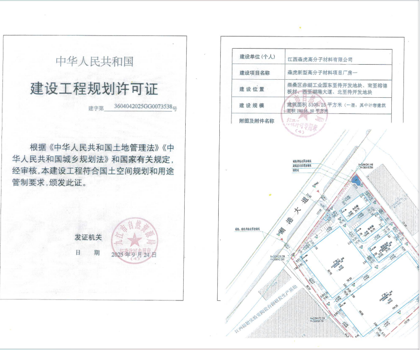 森虎新型高分子材料项目宿舍楼、办公楼、厂房一、厂房二、原料仓库、门卫建设工程规划许可证批准结果公示