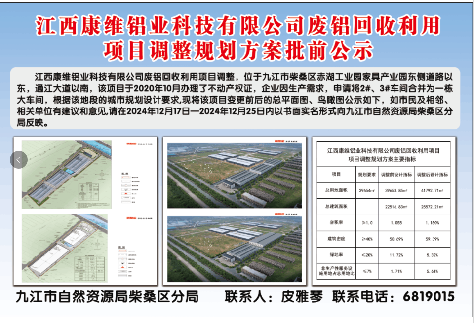 江西康维铝业科技有限公司废铝回收利用项目调整规划方案批前公示