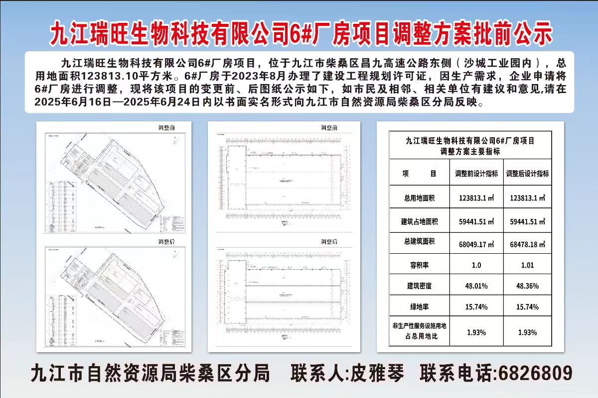 九江瑞旺生物科技有限公司6#厂房规划调整项目批前公示