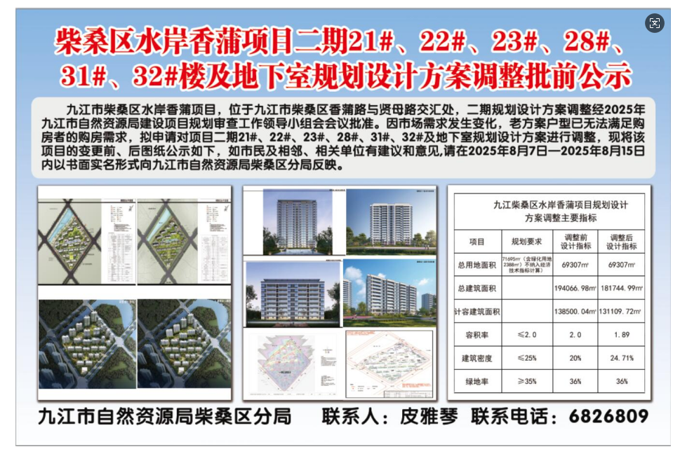 柴桑区水岸香蒲项目二期21#、22#、23#、 28#、31#、32#楼及地下室规划设计方案调整批前公示