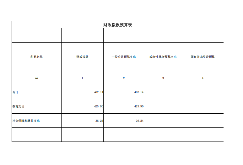 按支出功能科目划分:一般公共服务支出0万元,较上年预算安排增加(减少)0万元;国防支出0_万元,较上年预算安排增加(减少)0万元;公共安全支出0万元,较上年预算安排增加(减少)0万元;教育支出425.9万元,较上年预算安排增加52.37万元;科学技术支出0万元,较上年预算安排增加(减少)0万元;文化旅游体育与传媒支出0万元,较上年预算安排增加(减少)0万元;社会保障和就业支出36.24万元,较上年预算安排增加3.82万元;卫生健康支出0万元,较上年预算安排增加(减少)0万元;节能环保支出0万元,较上年预算安排增加(减少)0万元;城乡社区支出0万元,较上年预算安排增加(减少)0万元;农林水支出0万元,较上年预算安排增加(减少)0万元;交通运输支出0万元,较上年预算安排增加(减少)0万元;资源勘探工业信息等支出0万元,较上年预算安排增加(减少)0万元;商业服务业等支出0万元,较上年预算安排增加(减少)0万元;金融支出0万元,较上年预算安排增加(减少)0万元;自然资源海洋气象等支出0万元,较上年预算安排增加(减少)0万元;住房保障支出0万元,较上年预算安排增加(减少)0万元;粮油物资储备支出0万元,较上年预算安排增加(减少)0万元;灾害防治及应急管理支出0万元,较上年预算安排增加(减少)0万元;其他支出0万元,较上年预算安排增加(减少)0万元。