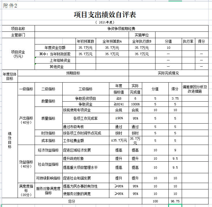 争资争项前期经费项目自评综述:根据年初设定的绩效目标,争资争项前期经费项目,我部门进行了绩效自评,得分为96.75分。项目全年预算数为35.7万元,执行数为35.7万元,完成预算的100%。主要产出和效果:一是争取的项目数量有待提升。由于项目前期经费有限,争取到的重大项目未达预期目标。改进措施:提前谋划下年度的重大前期项目,尽早制定方案,督促项目业主加快前期工作,争取更多的项目。二是经济效益有待进一步提高。有的重点项目前期工作受疫情影响,进度滞后,所以当年度较难完成目标任务。改进措施:加快项目实施的序时进度。帮助项目业主加快推进重大项目前期工作,深化项目前期工作深度,解决项目推进过程中的存在的各种问题。三是社会效益需进一步完善。改进措施:在今后工作中做好项目策划,不断完善各项工作制度,加强学习。本项目自评等级为优秀,可以公开。