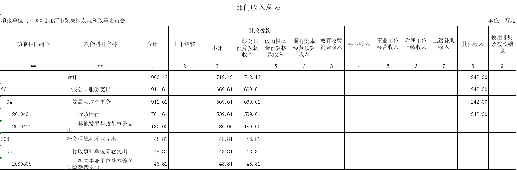 2024年柴桑区发展和改革委员会单位收入预算总额为960.42万元,较上年预算安排增加(减少)245.12万元;财政拨款收入718.42万元,较上年预算安排增加_3.12_万元;教育收费资金收入_0_万元,较上年预算安排增加(减少)_0_万元;事业收入_0_万元,较上年预算安排增加(减少)_0__万元;事业单位经营收入_0_万元,较上年预算安排增加(减少)__0_万元;附属单位上缴收入_0_万元,较上年预算安排增加(减少)__0_万元;上级补助收入_0_万元,较上年预算安排增加(减少)_0__万元;其他收入_242_万元,较上年预算安排增加__242_万元;使用非财政拨款结余_0_万元,较上年预算安排增加(减少)_0__万元;上年结转(结余)0_万元,较上年预算安排增加(减少)_0_万元。