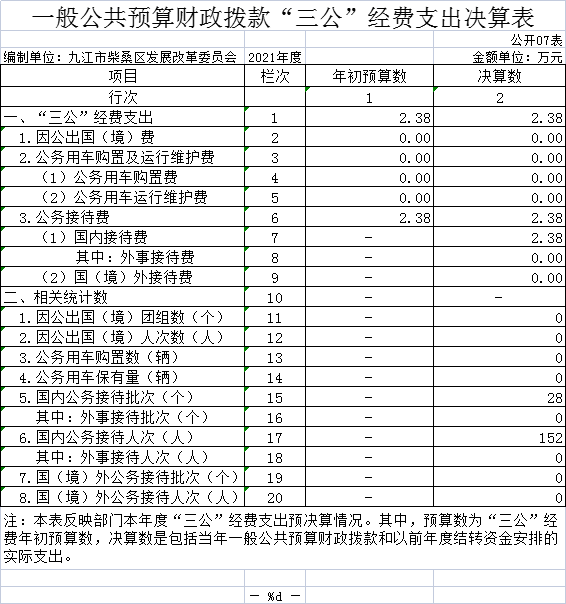 本部门2021年度一般公共预算财政拨款“三公”经费支出年初预算数为2.38万元,决算数为2.38万元,完成预算的100%,决算数较2020年减少5.2万元,下降60.61%,其中: