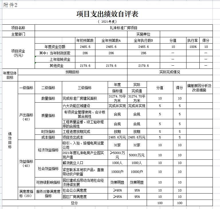 礼涞电商产业园省级标准厂房建设项目绩效自评综述:根据年初设定的绩效目标,礼涞电商产业园省级标准厂房建设项目,各项指标都符合指标值,得分为100分,自评等级为优秀。项目全年预算数为286万元,执行数为286万元,完成预算的100%。礼涞电商产业园省级标准厂房建设项目建成各项指标达标,没有偏离绩效目标。可以公开。