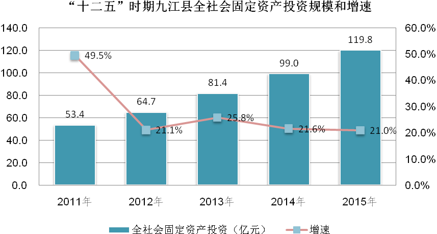 基础设施实现新突破。集中力量建设了一大批事关经济社会发展全局的基础设施项目,“十二五”时期全社会固定资产投资累计达418.3亿元,年均增长26.3%,实现五年翻三倍。综合交通体系建设全面展开,武九客专稳步推进,昌九高速“四改八”通远试验段、都九高速等工程顺利完工,城市水、电、路、气等基础设施进一步完善,改造405.6公里乡村公路,乡镇、行政村通油(水泥)路率达100%;能源网络顺利构建,农村电网升级改造工程、西气东输二线、省天然气管网顺利完成,中电投江洲风电、晶科光电建设步伐加快;水利建设全面加强,完成一般小(一)型水库除险加固工程8座、小(二)型水库除险加固工程50座、城市防洪工程22.27公里,连续3年实施了农田水利重点县项目,改善灌溉面积6万亩,水利防灾抗灾能力全面提高。