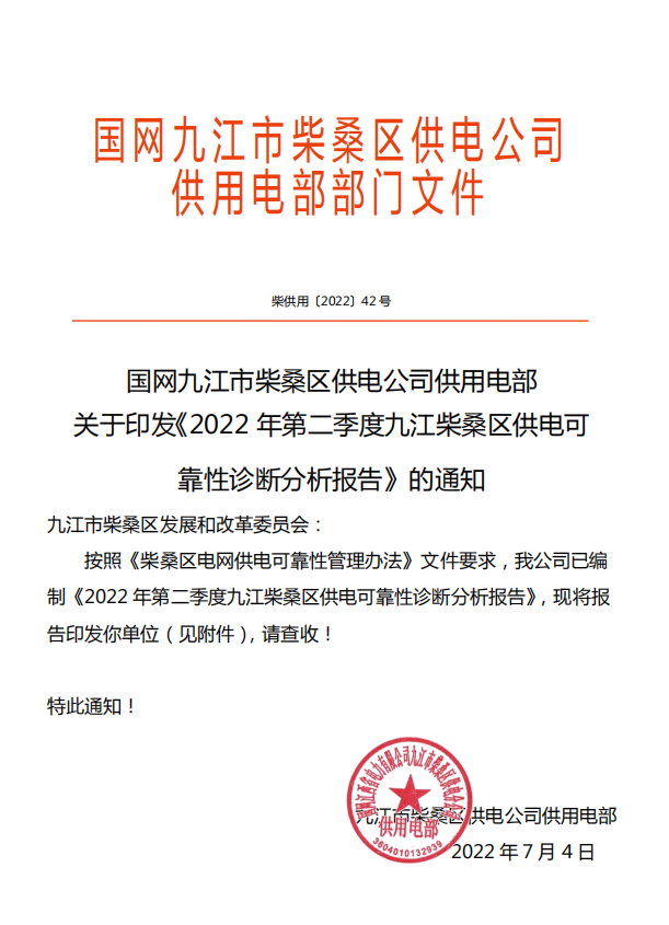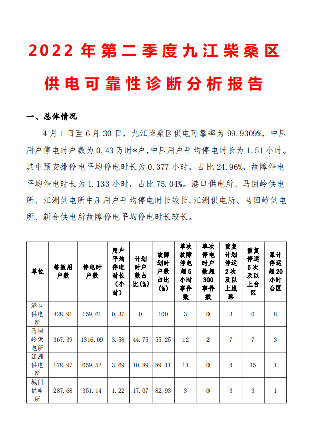关于印发《2022年第二季度九江柴桑区供电可靠性诊断分析报告》的通知