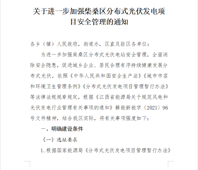 关于进一步加强柴桑区分布式光伏发电项目安全管理的通知