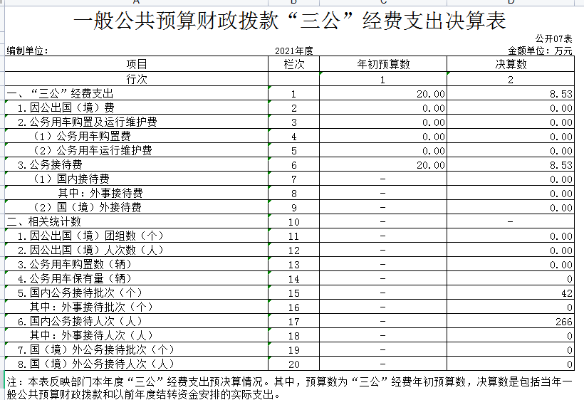 本部门2021年度一般公共预算财政拨款“三公”经费支出年初预算数为20万元,决算数为8.53万元,完成预算的11.47%。: