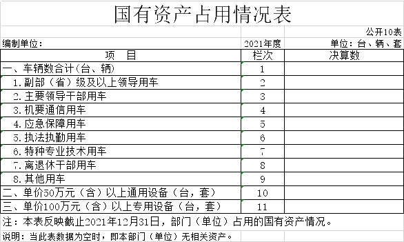 截至2021年12月31,本部门国有资产占用情况见公开10表《国有资产占用情况表》。其中车辆中的其他用车主要是截至2021年12月31日,本部门共有车辆0辆,其中,副部(省)级以上领导干部用车0辆、一般公务用车0辆、一般执法执勤用车0辆、特种专业技术用车0辆、其他用车0辆,单位价值50万元以上通用设备0台(套),单价100万元以上专用设备0台(套)。