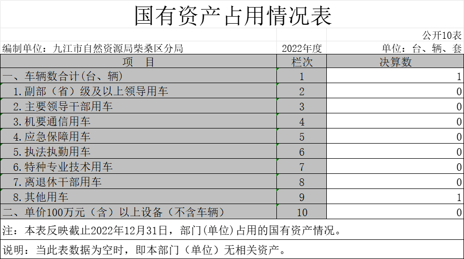 截至2022年12月31日,本部门国有资产占用情况见公开10表《国有资产占用情况表》。其中车辆中的其他用车主要是用于土地报批工作,市局对接汇报工作,执法执勤监察工作。