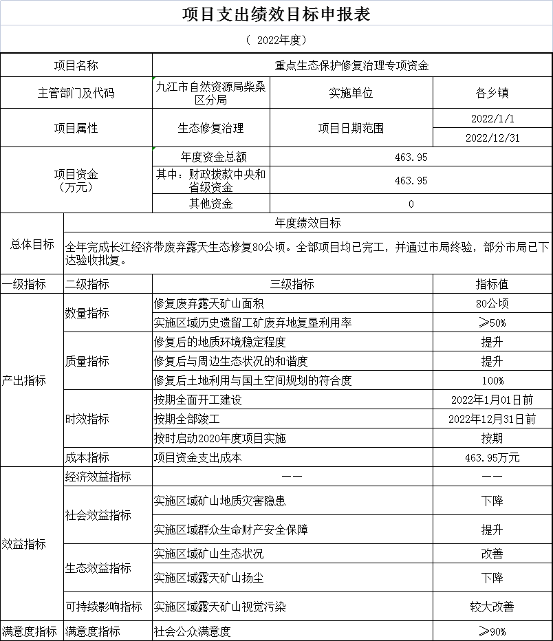 根据九江市财政局转发《江西省财政厅办公室关于做好生态环境保护领域各类专项资金绩效自评工作的通知》(九财资环〔2020〕2号)文件要求,为进一步规范中央专项资金管理,强化预算支出的责任和效率,提高专项资金使用效率,柴桑自然资源分局开展了2022年度废弃露天矿山治理专项资金绩效自评,共涉及资金 463.95 万元。