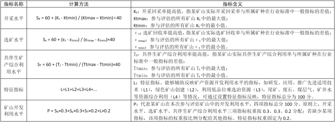 3.特征指标:研发、应用、推广先进适用技术(入选自然资源部最新版《矿产资源节约和综合利用先进适用技术目录》)情况,绿色矿山创建情况,低品位难选冶资源利用情况,尾矿、废石、煤层气、矿井水等其他资源综合利用等情况,特征指标总分100分。各省(区、市)评估涉及的各分项分值由部确定,各县(市、区)评估涉及的各分项分值由省级自然资源主管部门确定