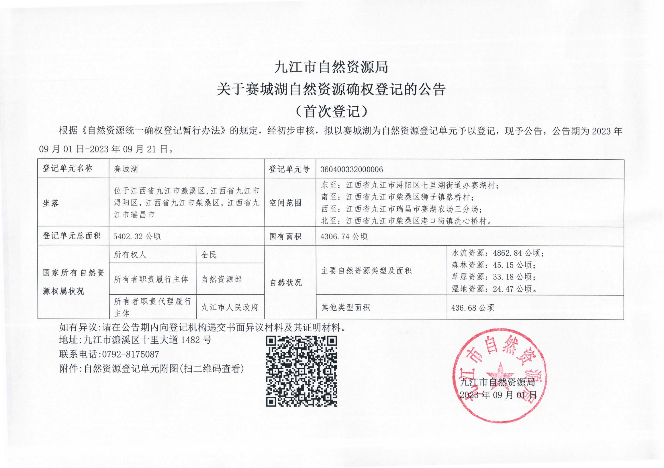 九江市自然资源局关于赛城湖自然资源确权登记的公告