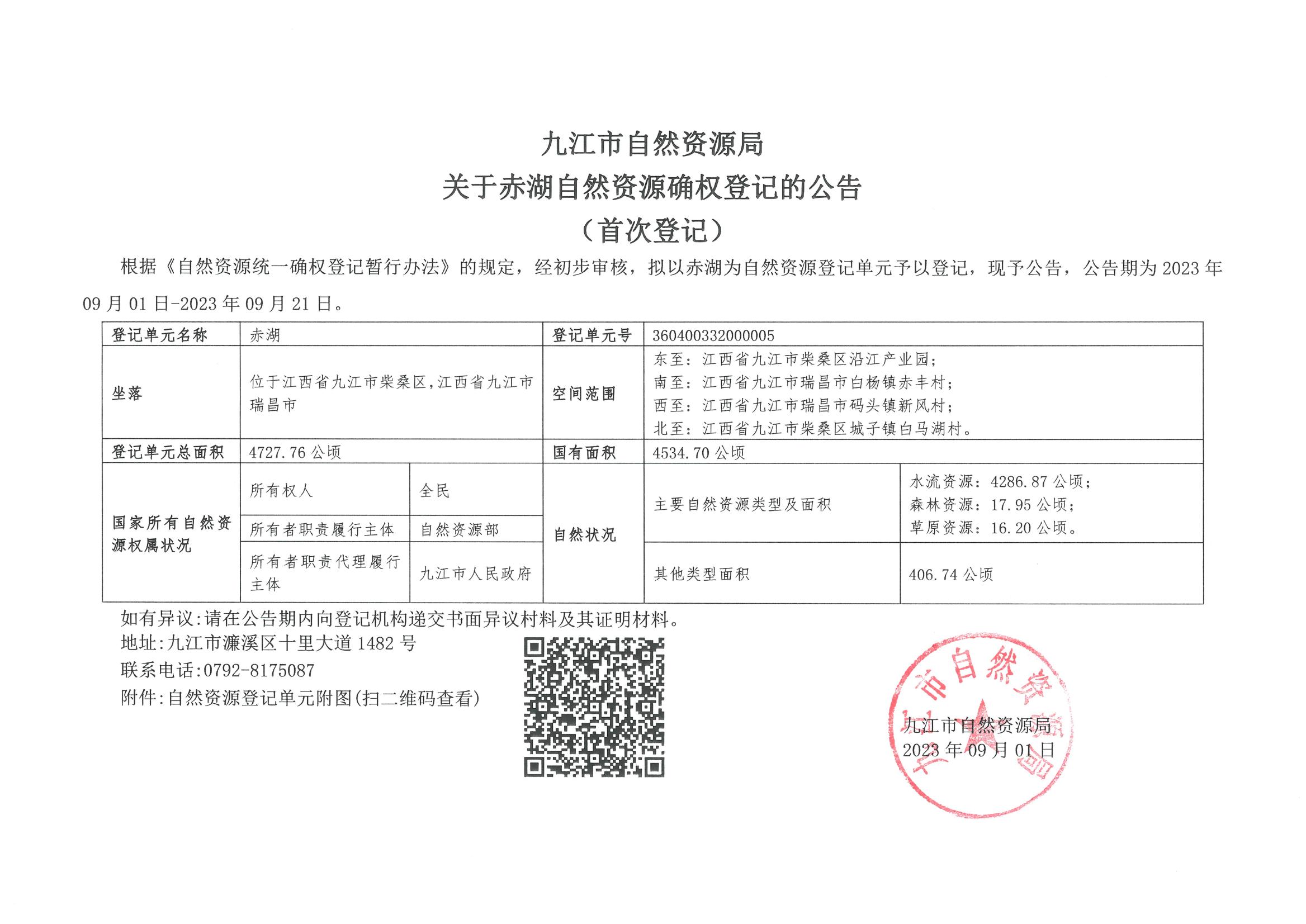 九江市自然资源局关于赤湖自然资源确权登记的公告
