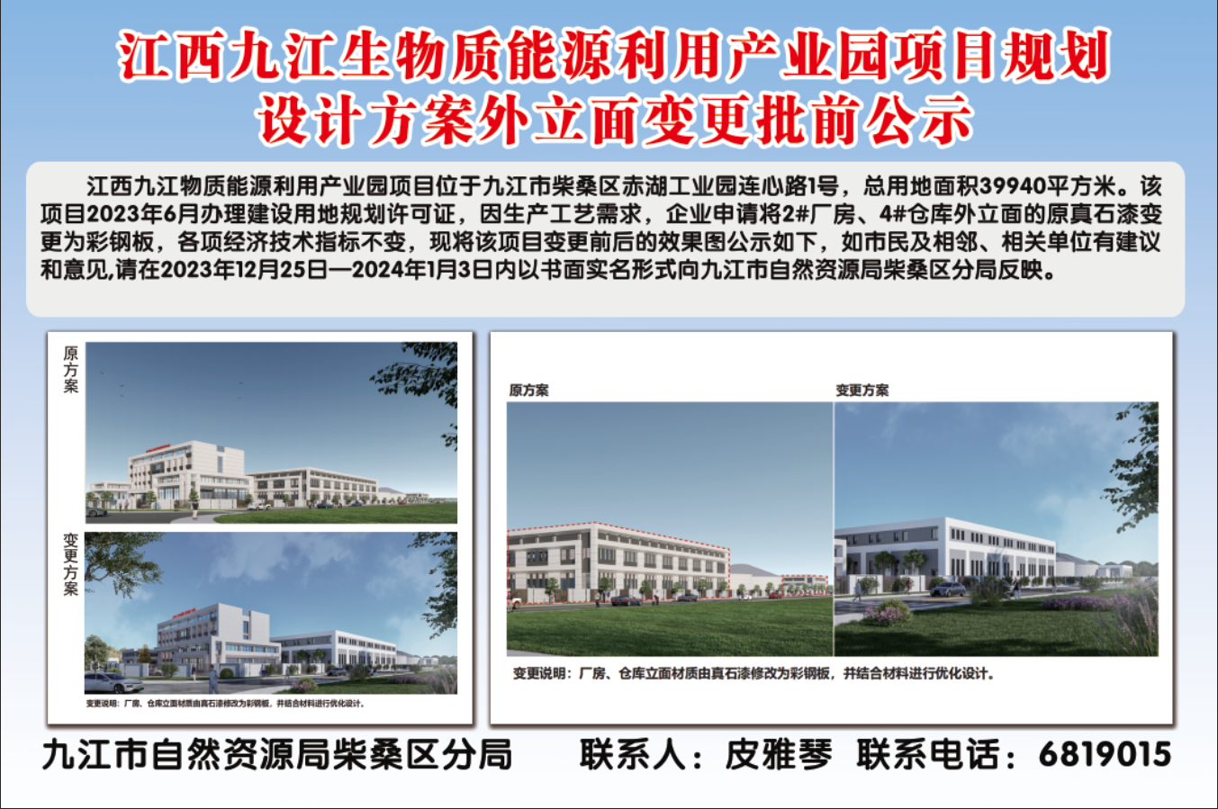 江西九江生物质能源利用产业园项目规划设计方案外立面变更批前公示