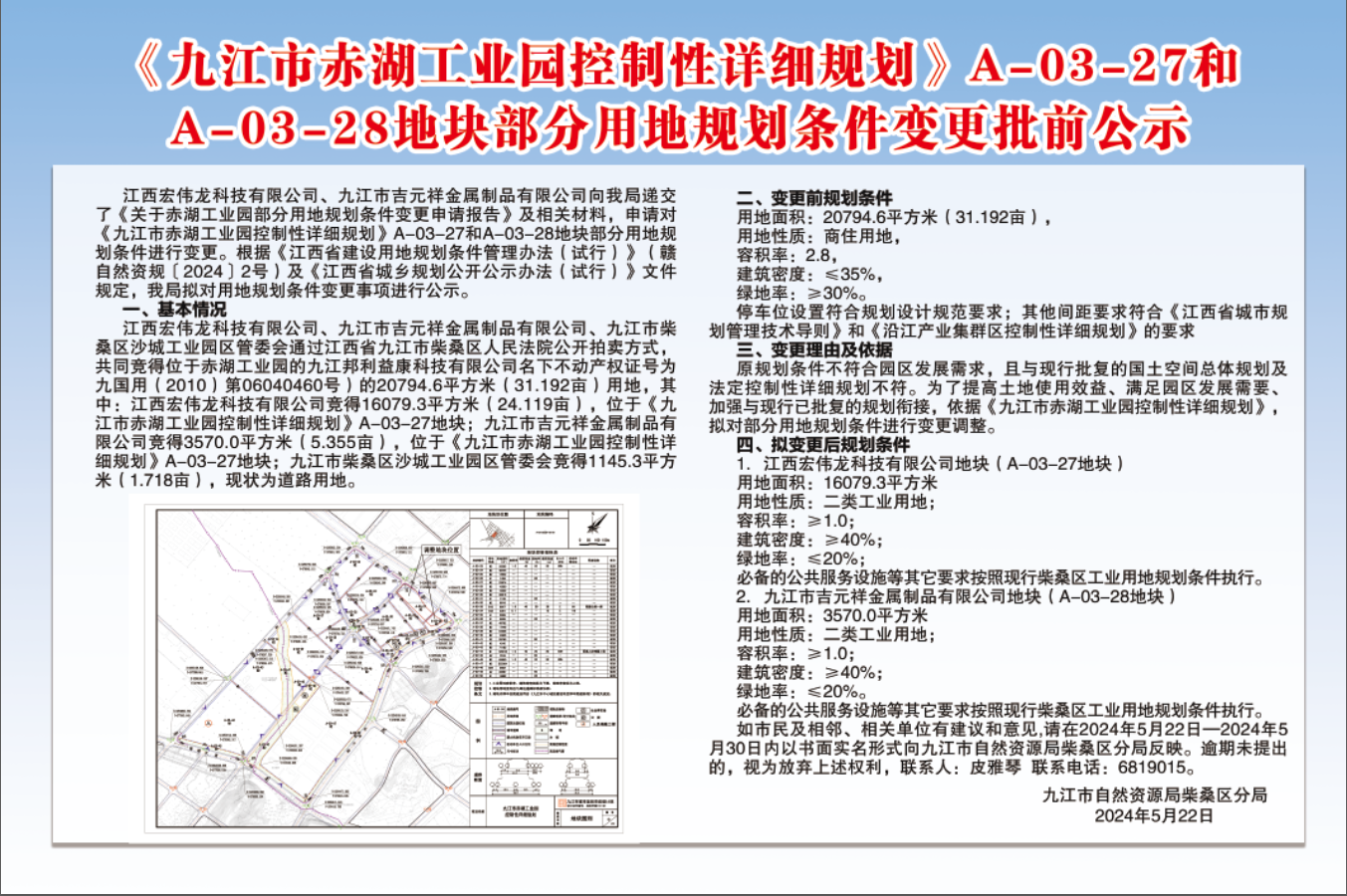 《九江市赤湖工业园控制性详细规划》A-03-27和A-03-28地块部分用地规划条件变更批前公示