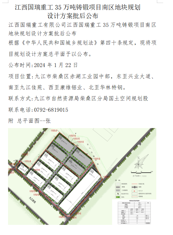 江西国瑞重工35万吨铸锻项目南区地块规划设计方案批后公布