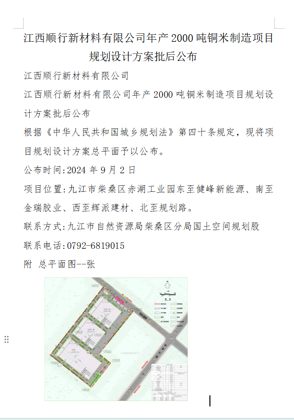 江西顺行新材料有限公司年产2000吨铜米制造项目规划设计方案批后公布