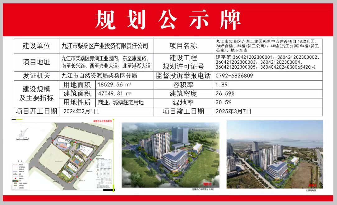 九江市柴桑区赤湖工业园邻里中心建设项目1#幼儿园、2#综合楼、3#楼(员工公寓)、4#楼(员工公寓)、5#楼(员工公寓)、地下车库批后公示