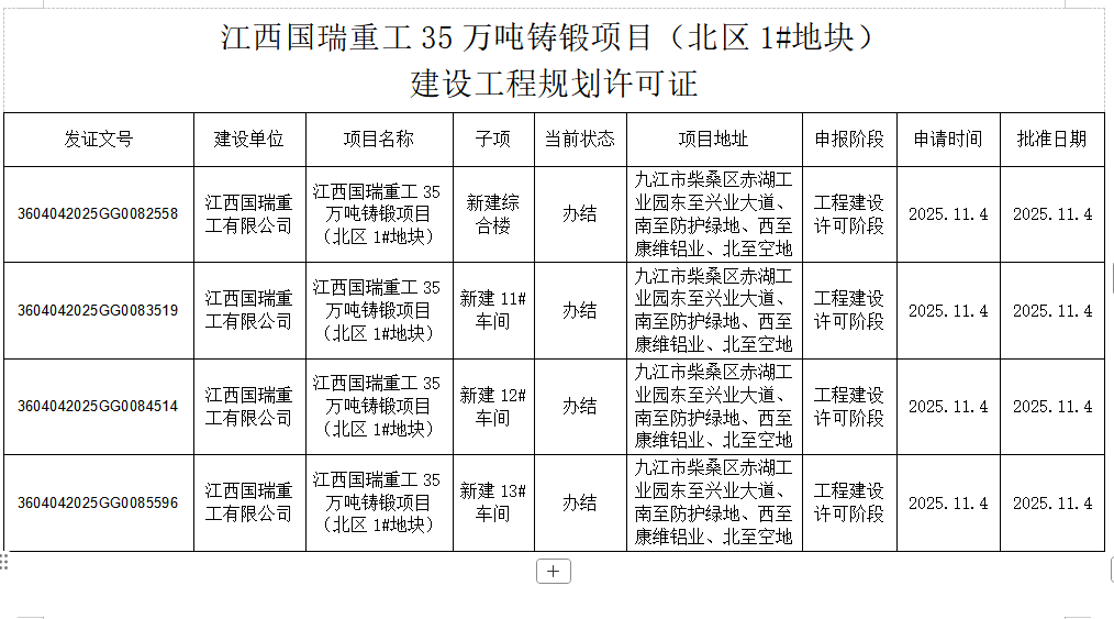 江西国瑞重工35万吨铸锻项目(北区1#地块)新建综合楼、11#车间、12#车间、13#车间建设工程规划许可批准结果公示