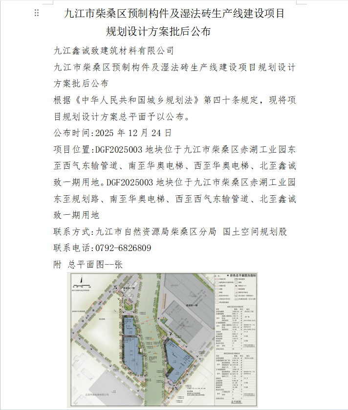 九江市柴桑区预制构件及湿法砖生产线建设项目规划设计方案批后公布