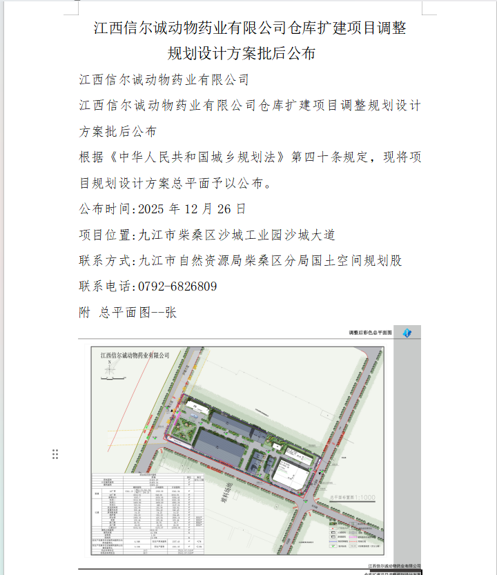 江西信尔诚动物药业有限公司仓库扩建项目调整规划设计方案批后公布