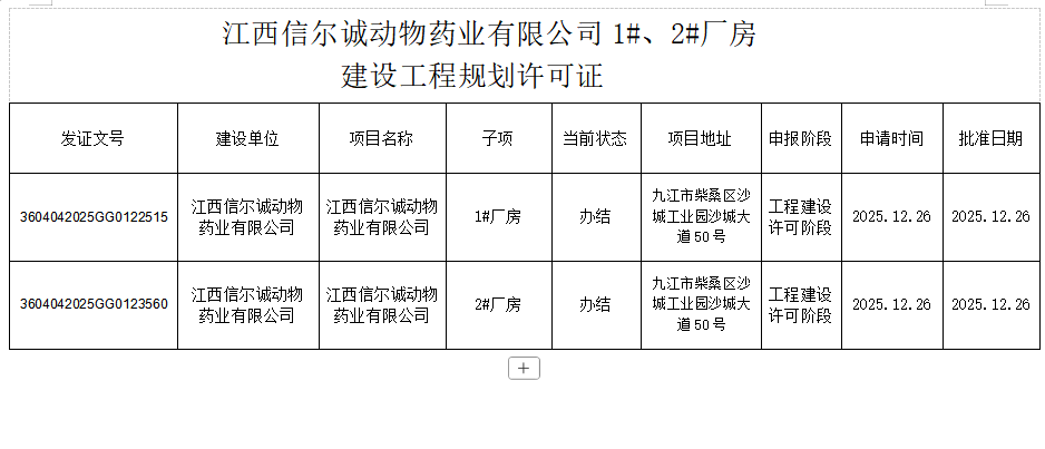 江西信尔诚动物药业有限公司1#、2#厂房 建设工程规划许可证批准结果公示