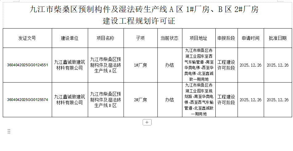 九江市柴桑区预制构件及湿法砖生产线A区1#厂房、B区2#厂房建设工程规划许可证批准结果公示
