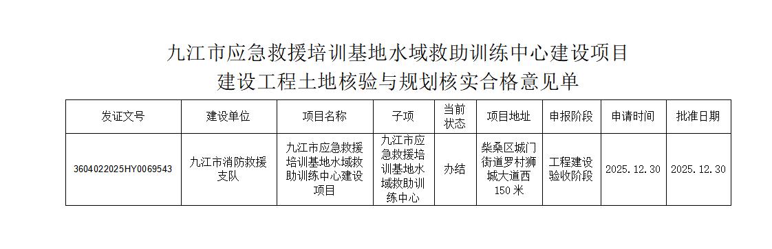 九江市应急救援培训基地水域救助训练中心建设项目 建设工程土地核验与规划核实合格意见单