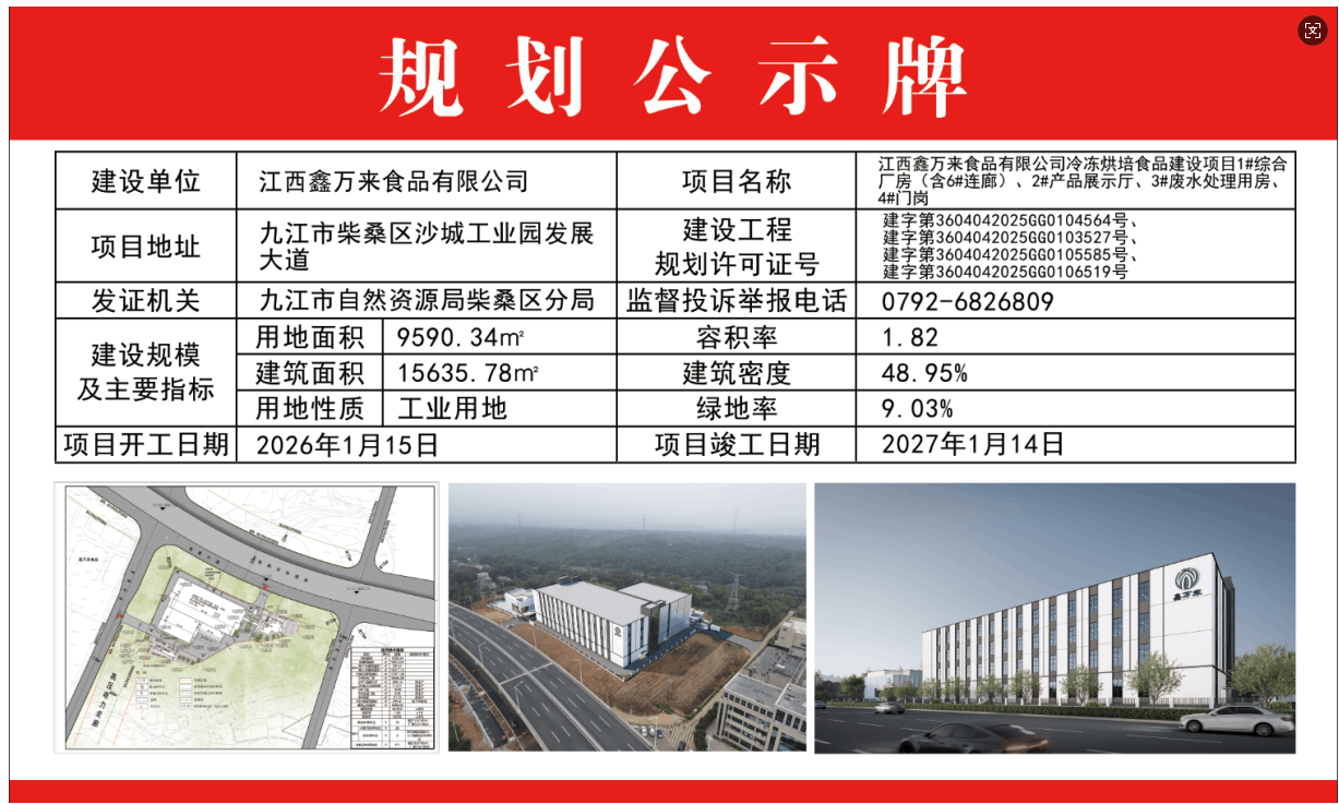 江西鑫万来食品有限公司冷冻烘培食品建设项目1#综合厂房(含6#连廊)、2#产品展示厅、3#废水处理用房、4#门岗批后公布