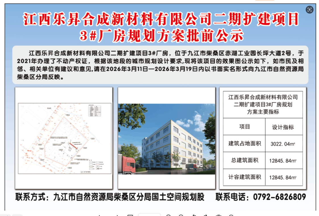 江西乐昇合成新材料有限公司二期扩建项目3#厂房规划方案批前公示