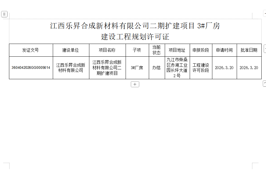 江西乐昇合成新材料有限公司二期扩建3#厂房建设工程规划许可批准结果