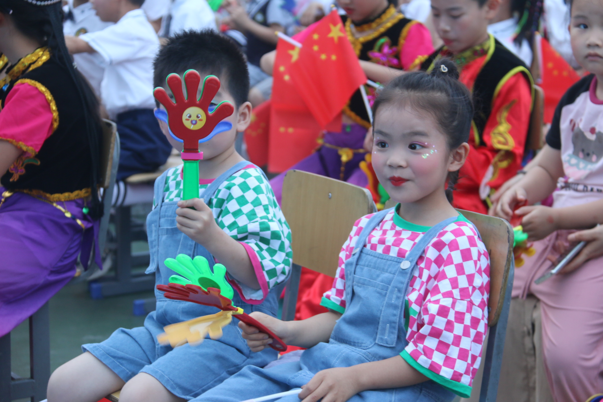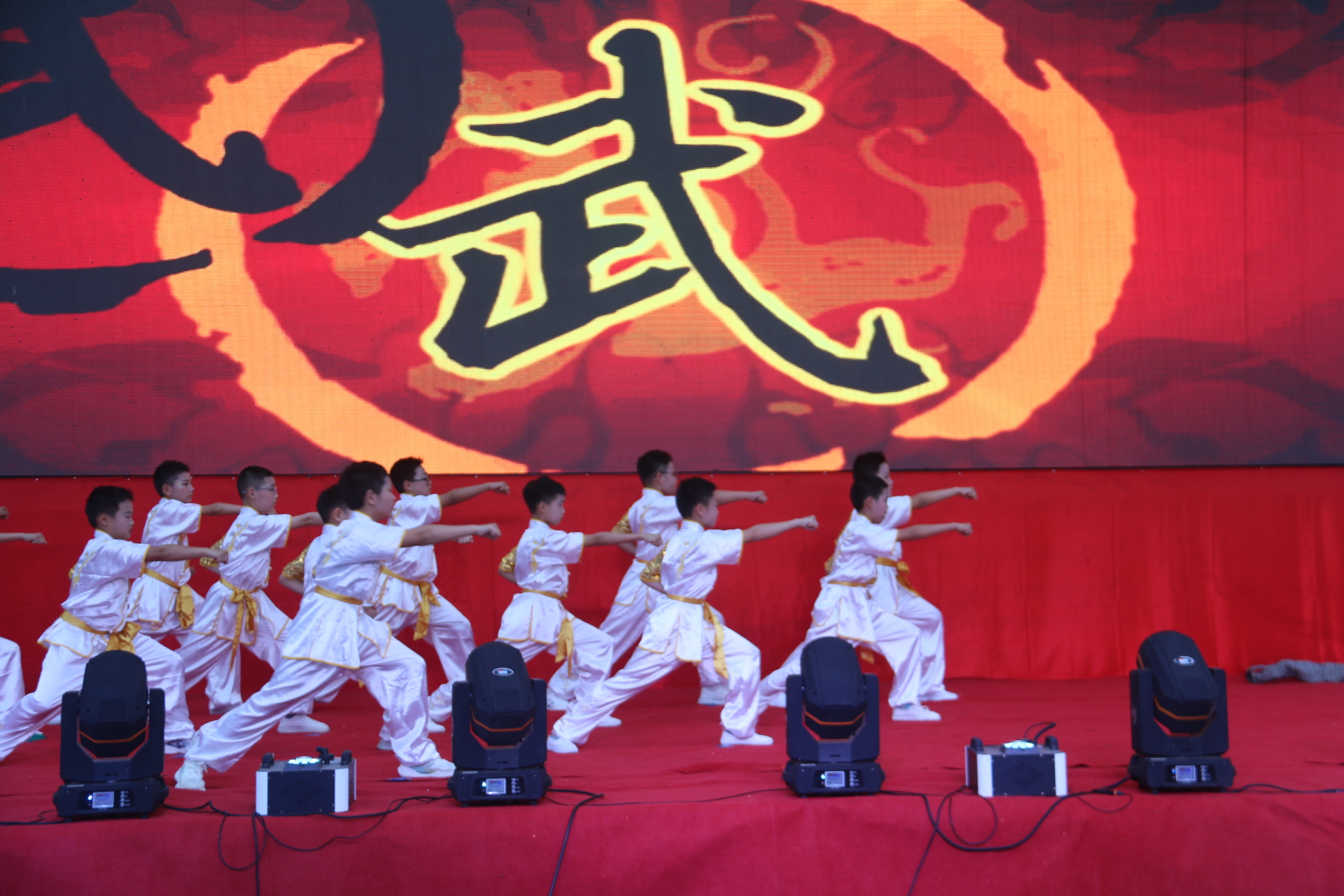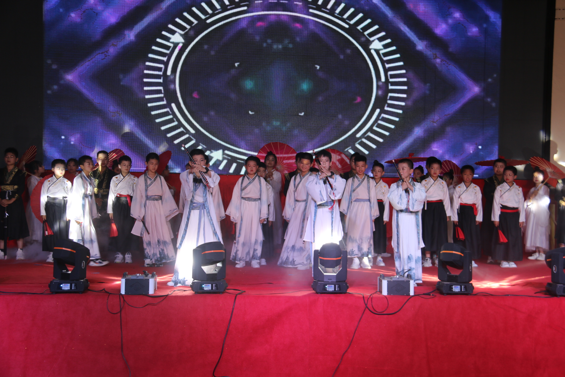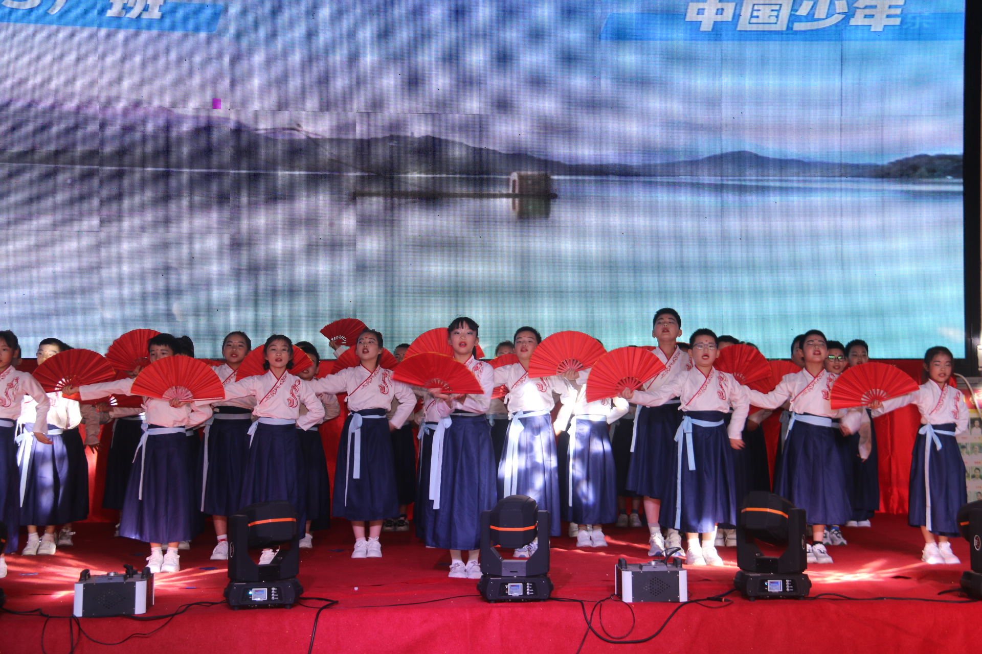 台上,小演员们身着节日的盛装,歌唱着、舞动着: 武术、走秀、古筝、 情景剧、诗词吟诵、快板、合唱等才艺展示好戏连台,精彩纷呈。