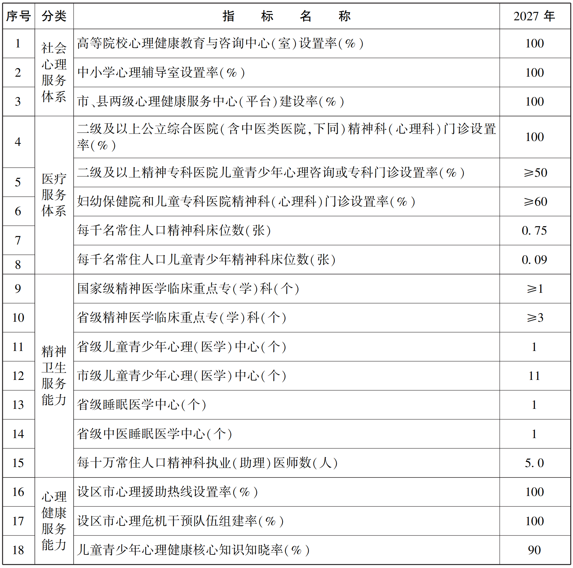 到2027年,建立“政府统一领导、部门分工负责、社会广泛参与、学校家庭尽责尽力”的儿童青少年心理健康工作机制,实现全省儿童青少年心理健康活动有阵地、服务有队伍、经费有保障,儿童青少年心理健康服务资源基本满足需求、服务专业化水平显著提高,儿童青少年心理健康素质明显提升,儿童青少年社会认知和主动就医意识进一步增强。