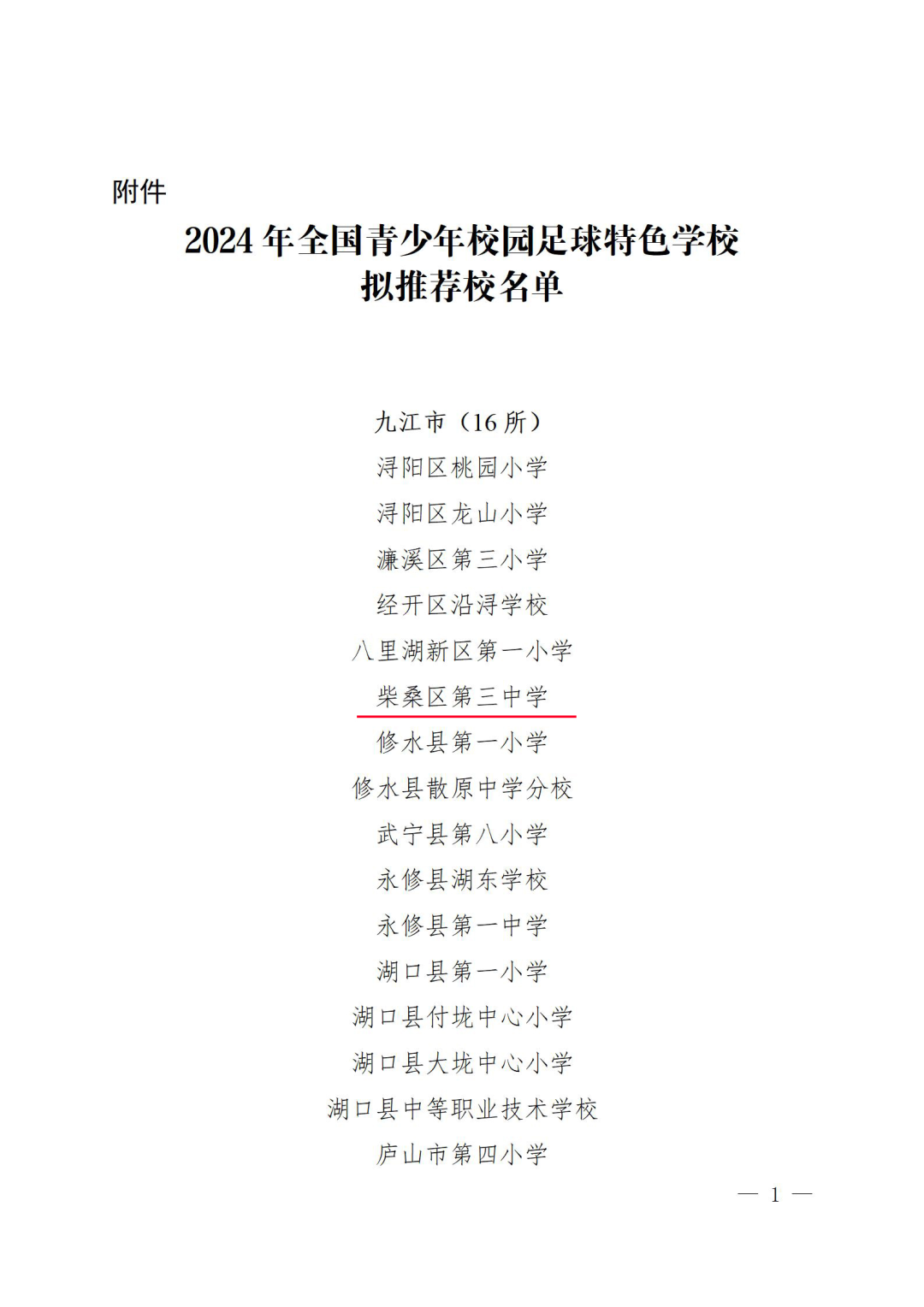 柴桑区三中拟获推荐全国青少年足球特色学校